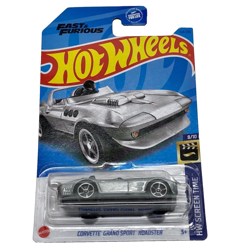 Vehículo de metal tremendamente detallado, en este caso se trata de una fiel réplica a escala del modelo clásico Fast & Furious - Corvette Grand Sport Roadster (154/250), con Referencia HW154_ASS9, viene dentro de una caja expositora de cartón con ventana transparente.