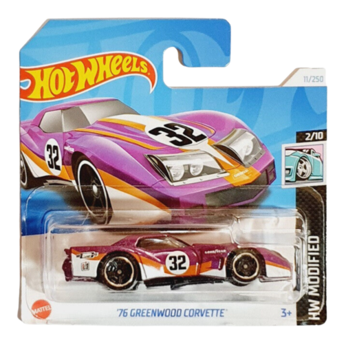 Vehículo de metal tremendamente detallado, en este caso se trata de una fiel réplica a escala del modelo clásico Modified - 76 Greenwood Corvette (11/250), con Referencia HW11_ASS50, viene dentro de una caja expositora de cartón con ventana transparente.
