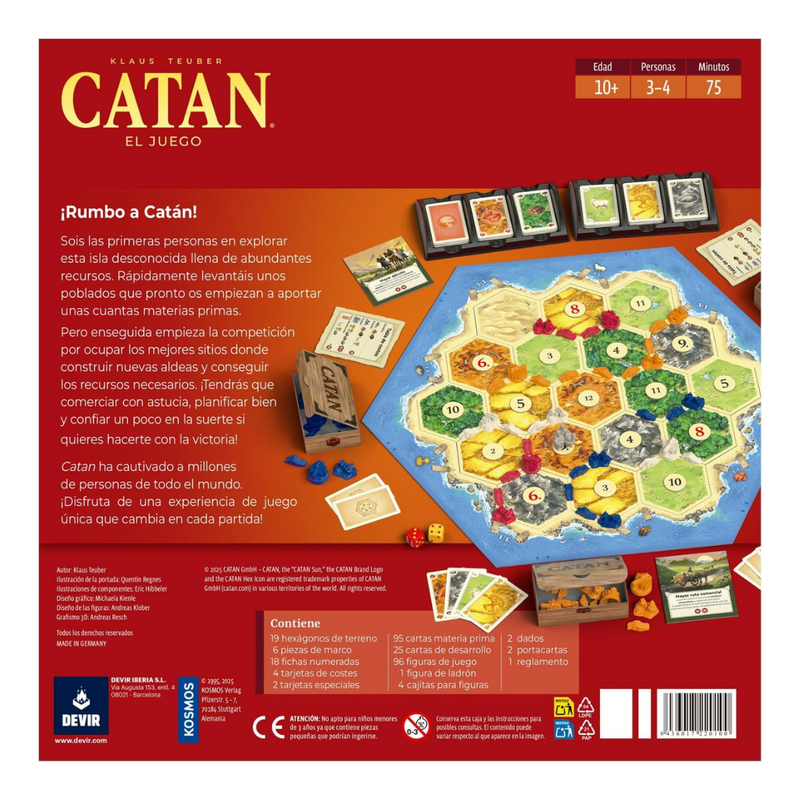 La clave del éxito reside en el comercio: los jugadores intercambian cartas para construir carreteras, poblados y ciudades, buscando alcanzar los 10 puntos de victoria. La interacción es constante gracias a las negociaciones, el control de puertos y la figura del ladrón, que bloquea la producción. Es un juego equilibrado y altamente rejugable, ideal como puerta de entrada al hobby debido a sus reglas sencillas y partidas emocionantes.
