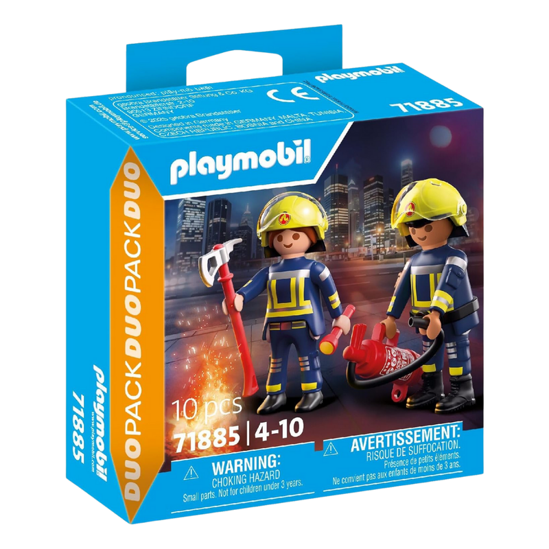 ¡Únete al cuerpo de bomberos y ayúdales a apagar los incendios de tu ciudad! Disfruta con este set de Bomberos .¡Llamada de emergencia! El DuoPack Bomberos PLAYMOBIL está listo para la acción. Ya sea un edificio en llamas o una pequeña misión de rescate, estos dos intrépidos bomberos siempre están preparados. Equipados con un hacha, una linterna y un extintor, pueden hacer frente a cualquier emergencia. Sus cascos cuentan con viseras abatibles para intercambiar rápidamente el equipo y mejorar la visibilidad. Los niños y niñas pueden sumergirse en imaginativas aventuras de bomberos y crear sus propias historias. Los DuoPacks de PLAYMOBIL son perfecto para el juego creativo o como un emocionante complemento a cualquier colección PLAYMOBIL.