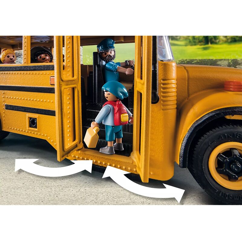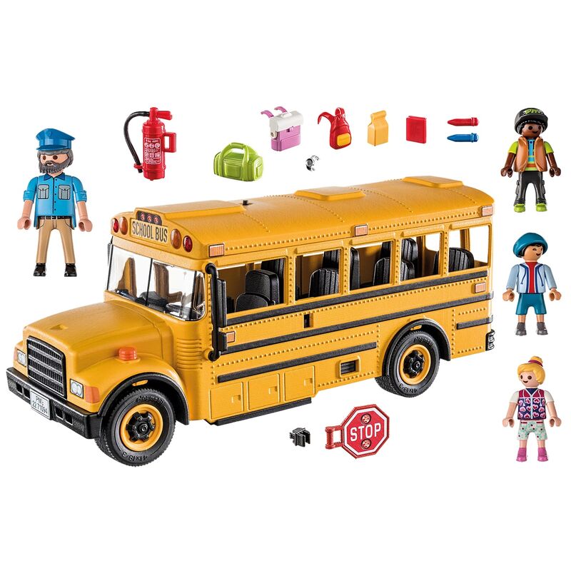 Playmobil nos trae el set Bus escolar. ¡Hora de ir al colegio! Sal a aprender un día entero en el divertido BUS escolar de PLAYMOBIL. Las luces delanteras y traseras funcionan y parpadean cuando el conductor se acerca a la parada y extiende la señal de stop. Al abrirse las puertas, los niños suben y eligen asiento. Accede al amplio interior, con capacidad para siete figuras, gracias al techo desmontable. El set incluye 4 figuras PLAYMOBIL: un conductor y tres estudiantes, además de mochilas, bolsa de almuerzo, lápices, extintor, cuaderno y señal de stop