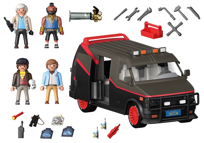PLAYMOBIL ® nos trae el FURGÓN DEL EQUIPO A - EXCLUSIVO, basado en una serie de televisión estadounidense de acción de los años 80 de la NBC creada por Frank Lupo y Stephen J. Un comando compuesto por los mejores cuerpos del ejercito estadounidense veteranos de la guerra de Vietnam. Son encarcelados por un delito que no habían cometido hasta que se fugan de la prisión que los retenía y, buscados por el gobierno sobreviven como mercenarios únicamente por causas justas.