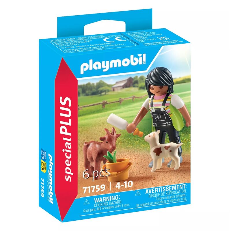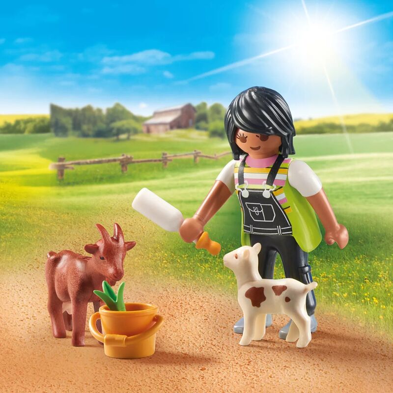 Playmobil celebra la vida rural con el set Mujer con Cabras. Incluye 1 figura de granjera, 2 cabras, una valla de madera, un cubo de leche, una pala y vegetación decorativa. ¡Ideal para crear escenarios campestres o enseñar sobre cuidado animal y sostenibilidad!