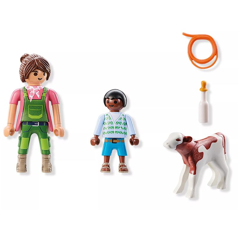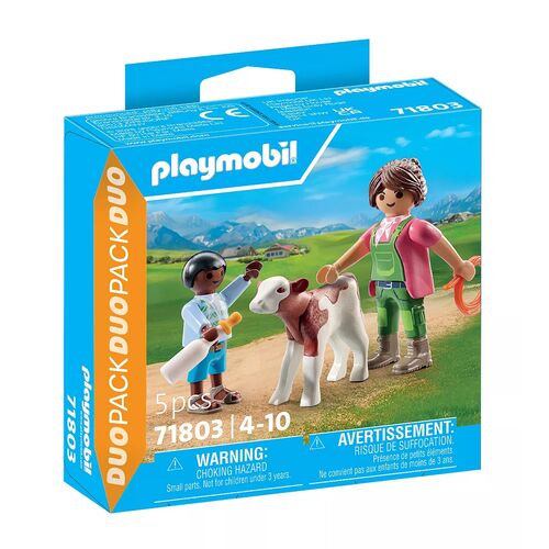 Playmobil da vida al encanto rural con el Duo Pack Granjera con Ternero. ¡Ideal para enseñar a los niños el cuidado de animales y las tareas diarias de granja mediante el juego imaginativo!