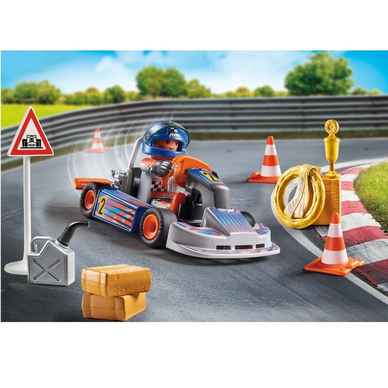 Playmobil nos trae el set Kart de Carreras . El set contiene un a figura de piloto, un kart, una copa, una corona de ganador, un casco, una señal de tráfico, tres conos y un bidón de gasolina. ¡Hay una emocionante aventura esperándote!