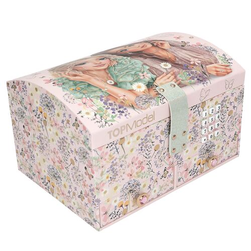 Joyero de gran tamaño con tonos rosa pálido, con temática floral. Tiene dos cajones, una bandeja de 3 compartimentos que puede extraerse y un espejo en el interior de la tapa abatible. Protegido por un código numérico que puede ser modificado siguiendo unos pasos sencillos. Al introducir el código correctamente, el joyero se abre y suena la canción “Shivers" durante 20 segundos aproximadamente.